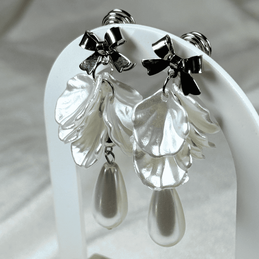 Silver-Tone Teardrop Pearl & Petal Clip-On Dangle Earrings: Nola